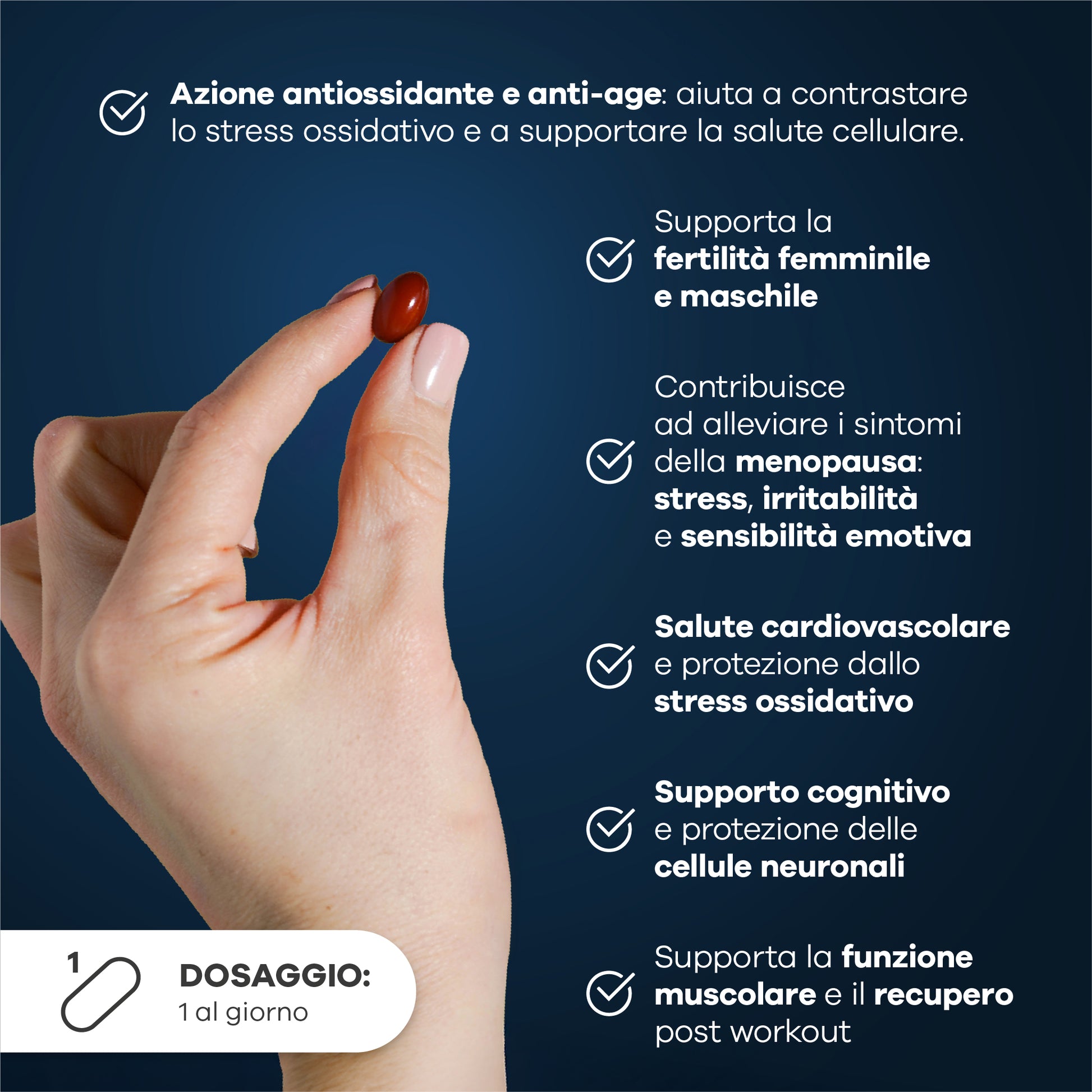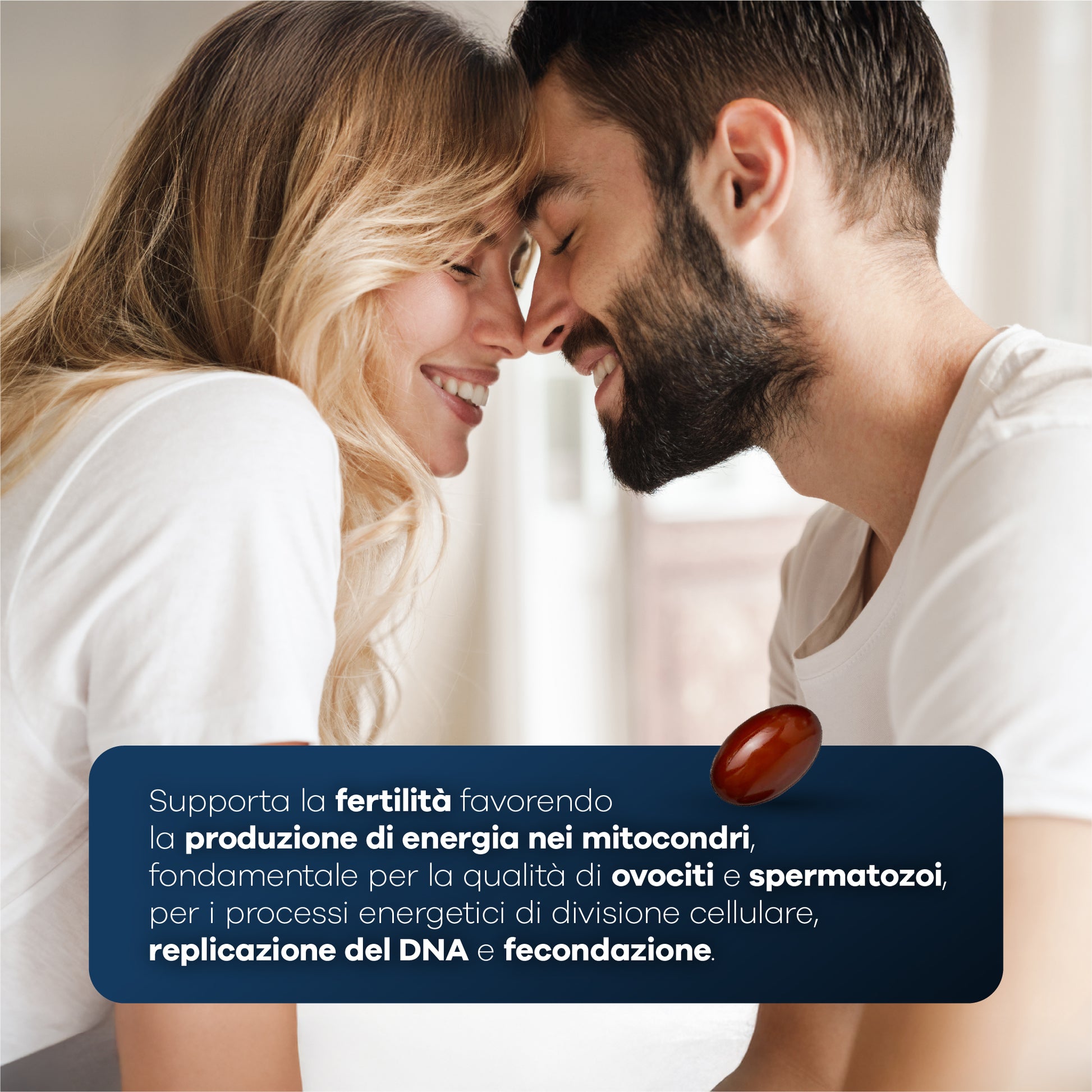 A livello dell’apparato riproduttivo, l'ubichinolo favorisce la produzione di spermatozoi sani, supportando i processi energetici di divisione cellulare, replicazione del DNA e fecondazione. Mantenendo una salute mitocondriale ottimale, l'ubichinolo garantisce che le cellule riproduttive dispongano di abbondanti riserve energetiche, il che può contribuire a promuovere la fertilità e il successo riproduttivo.