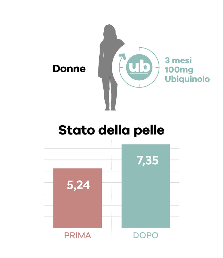 Inoltre, l'ubichinolo supporta la produzione di collagene, mantenendo l'elasticità e la tonicità della pelle.