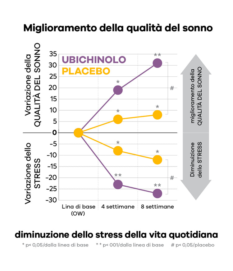 Lo stress ossidativo può alterare i ritmi del sonno. Contrastando il danno ossidativo, l'ubichinolo contribuisce a promuovere uno stato di maggiore rilassamento, favorendo una migliore qualità e durata del sonno.