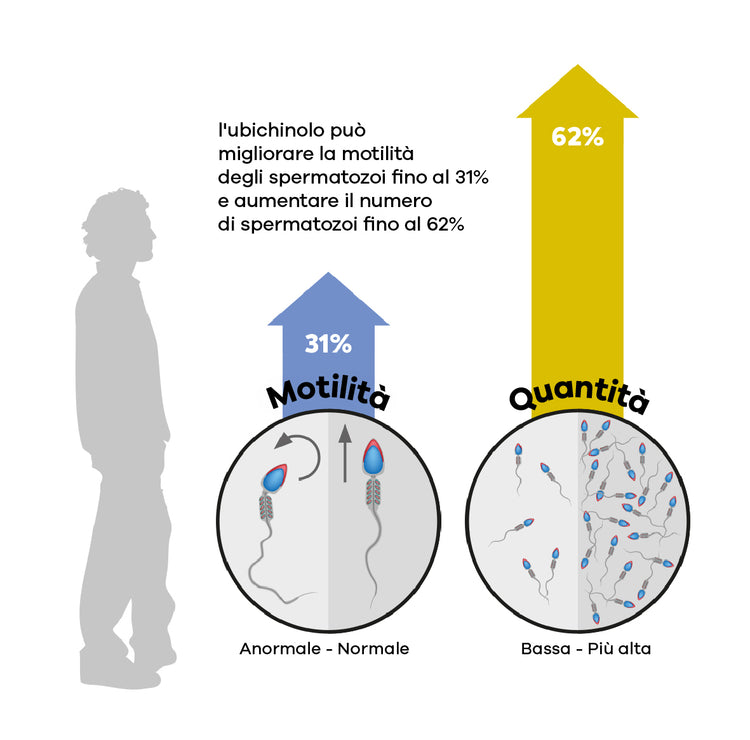 L'integrazione di ubichinolo si è dimostrata benefica per la salute e la fertilità degli spermatozoi perché svolge un ruolo essenziale nella produzione di ATP, necessario per la spermatogenesi e cruciale per la motilità degli spermatozoi.