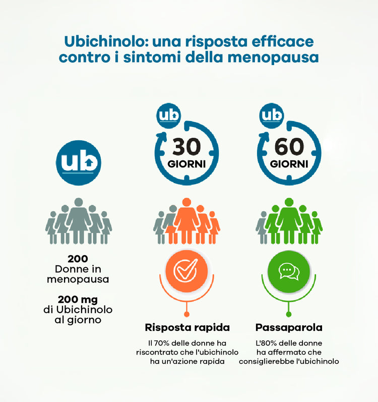 Un recente studio ha inoltre evidenziato che l’integrazione quotidiana di ubichinolo può contribuire ad alleviare alcuni sintomi della menopausa, con una riduzione di stress, irritabilità e sensibilità emotiva, favorendo un miglioramento dell’umore e una maggiore stabilità emotiva.