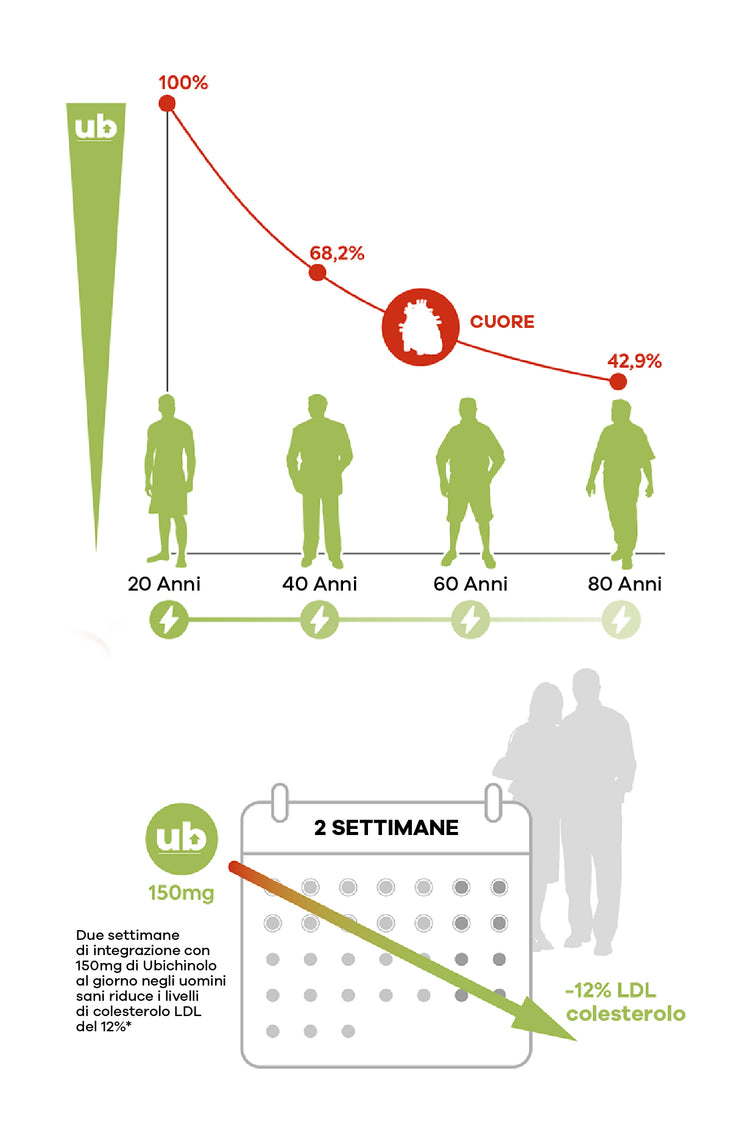 Con il passare degli anni, i livelli naturali di ubichinolo (la forma attiva del Coenzima Q10) diminuiscono progressivamente.