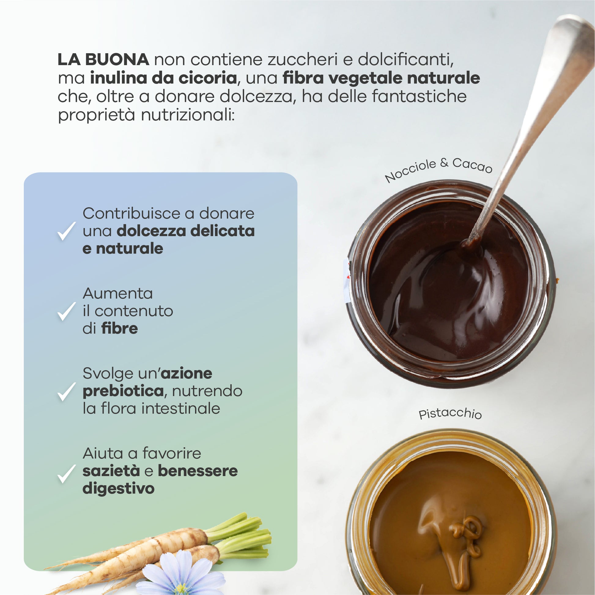 Al posto di zuccheri e dolcificanti, abbiamo scelto l’inulina, una fibra naturale estratta dalla radice di cicoria.