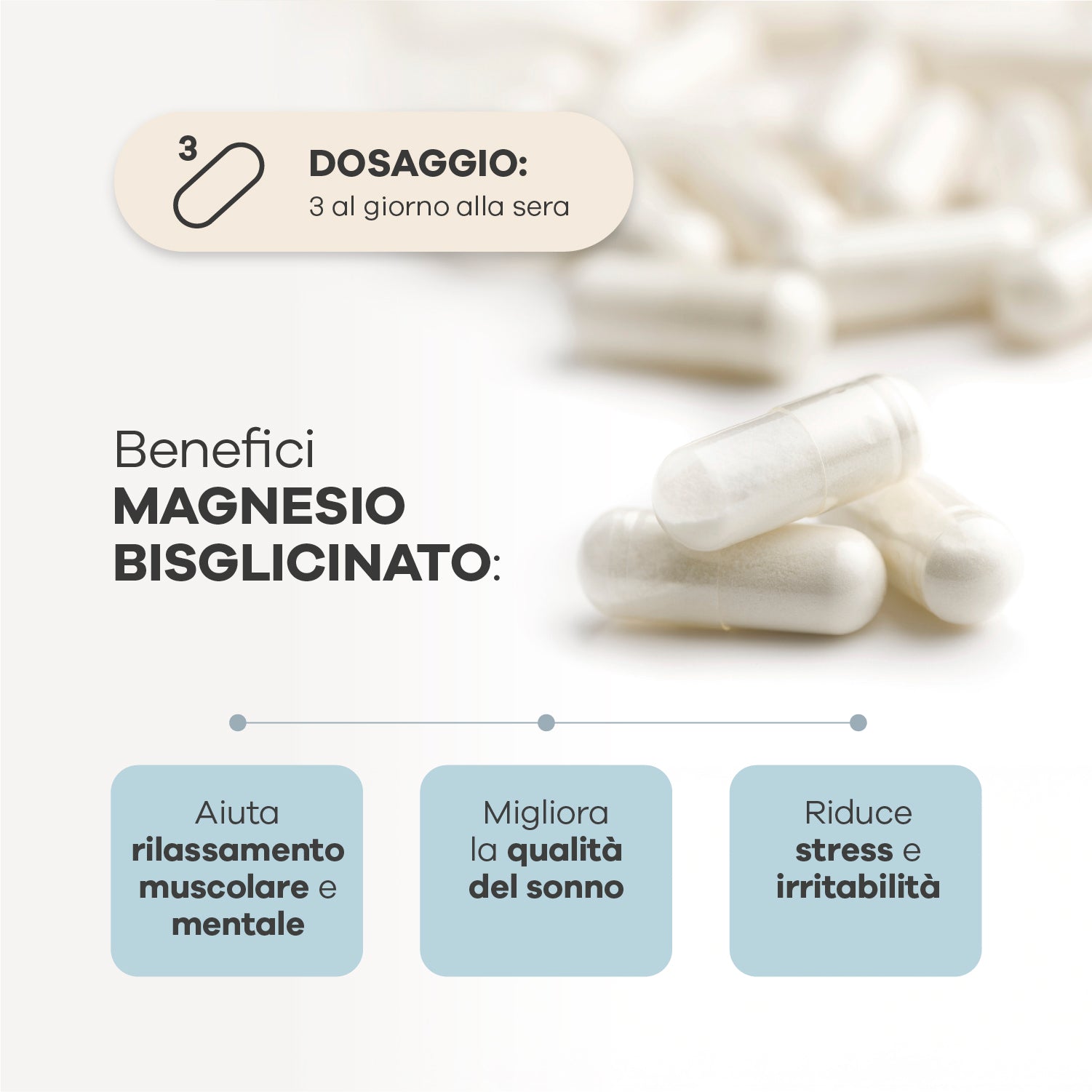Ogni dose giornaliera (3 capsule) apporta 1500 mg di magnesio bisglicinato, pari a 300 mg di magnesio puro, altamentedigeribile, biodisponibile ed efficace.