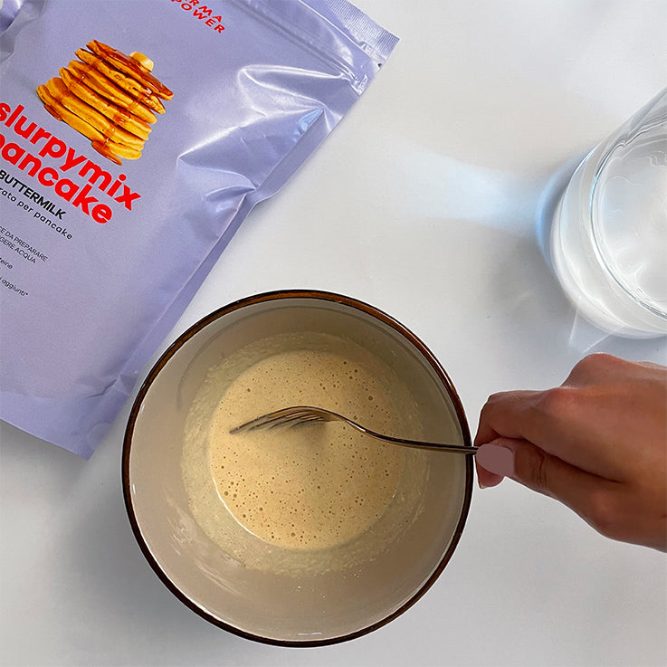 Scopri SlurpyMix, il preparato per pancakes proteici che rende ogni colazione un momento speciale. Con la sua formula innovativa e bilanciata, SlurpyMix permette di preparare soffici e deliziosi pancakes in pochi minuti: basta aggiungere acqua, mescolare, e cuocere!
