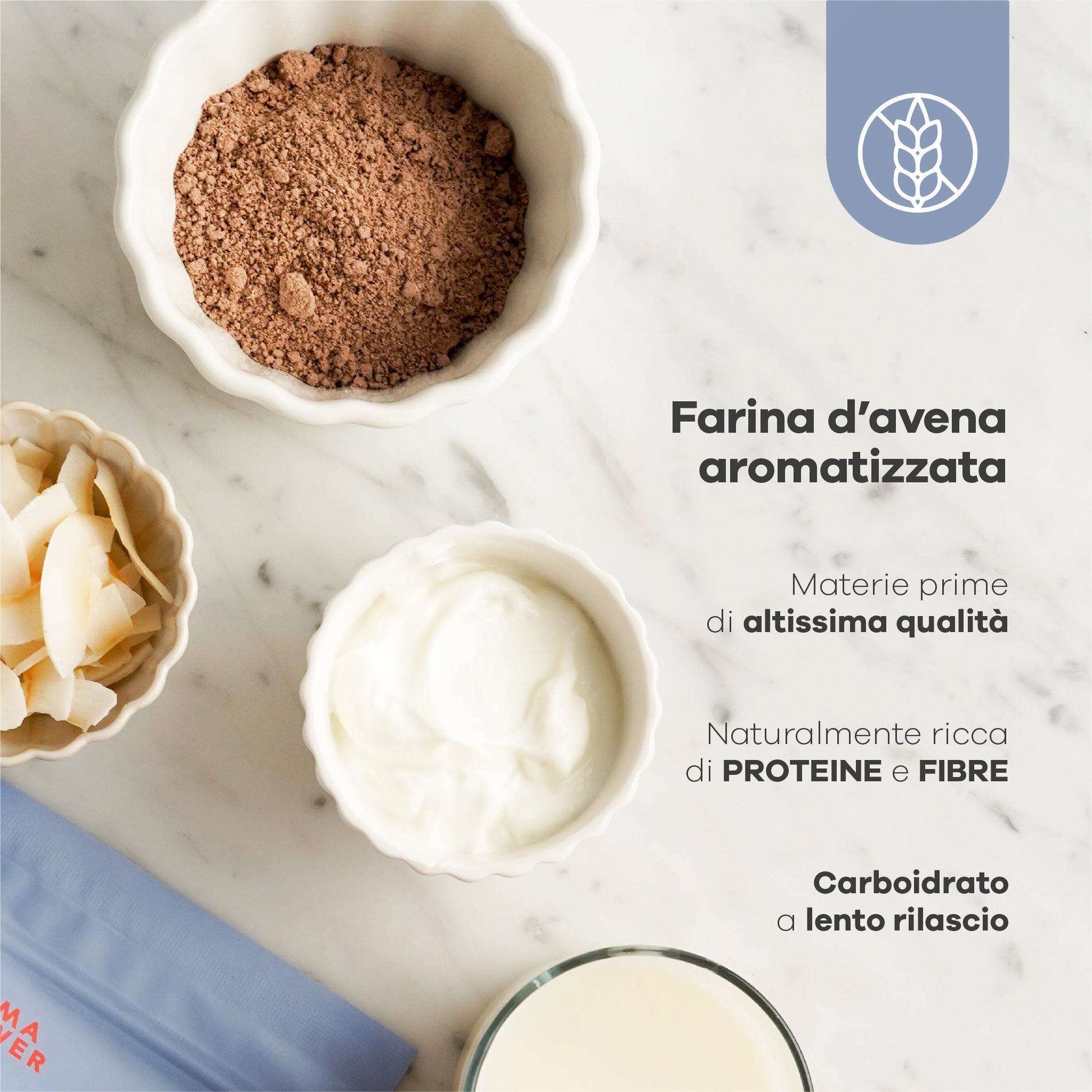 Ingredienti: Farina di avena integrale senza glutine (80%), cocco rapè (9%), cacao amaro (7,5%), aroma, sale, edulcorante: sucralosio.